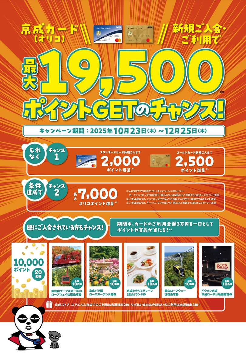①京成カード(オリコ)ゴールドカードに新規ご入会いただいた方に、京成グループポイントをもれなく2,500ポイント進呈。 ②京成カード(オリコ)スタンダードカードに新規ご入会いただいた方に、京成グループポイントをもれなく2,000ポイント進呈。